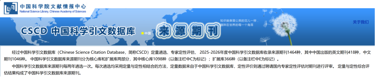 中国科学引文数据库是中国科学院文献情报中心于1989年建立,现已发展成为我国最具影响力的科学引文数据库之一。CSCD每两年遴选一次,每次遴选均采用定量与定性相结合的方法,定量数据来自于中国科学引文数据库,定性评价则通过聘请国内专家定性评估对期刊进行评审。2025-2026年度中国科学引文数据库收录来源期刊1464种,其中核心库1098种,扩展库366种。